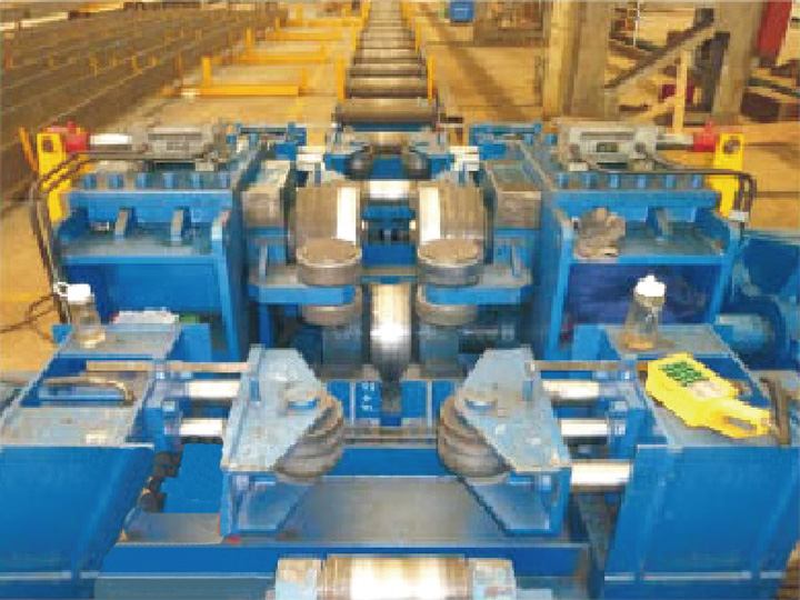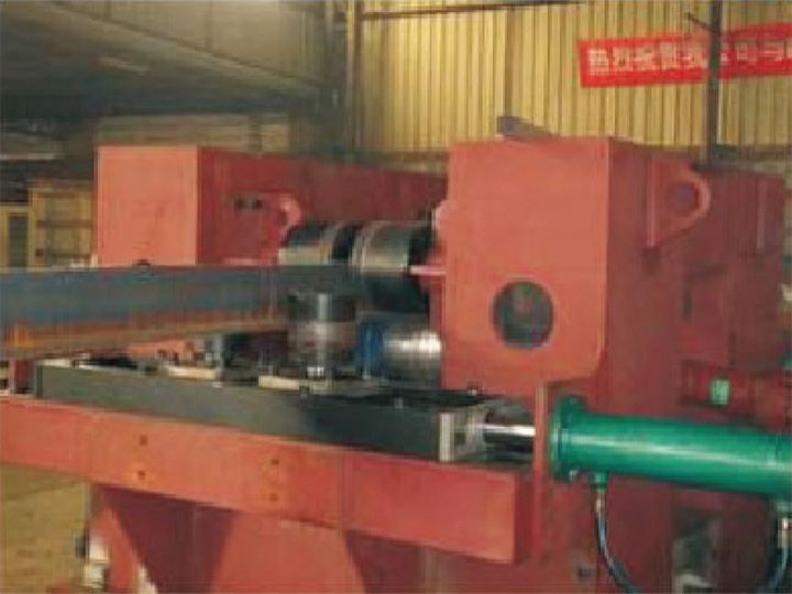 本機主要包括主機部分、前后液壓浮動輥道、液壓系統(tǒng)、電氣系統(tǒng)及其它輔件。主機前后各設(shè)一套液壓頂升裝置, 利用主傳動輥作為支點,其中一套液壓頂升裝置作頂升動力頭用來矯正T型材的上拱。主機前側(cè)左右各設(shè)一套液壓頂升裝置,主機后側(cè)各設(shè)二套液壓頂升裝置,利用同一側(cè)的兩套頂升裝置作支點另一側(cè)一套液壓頂升裝置作壓頭,用來矯正T型材的旁彎。