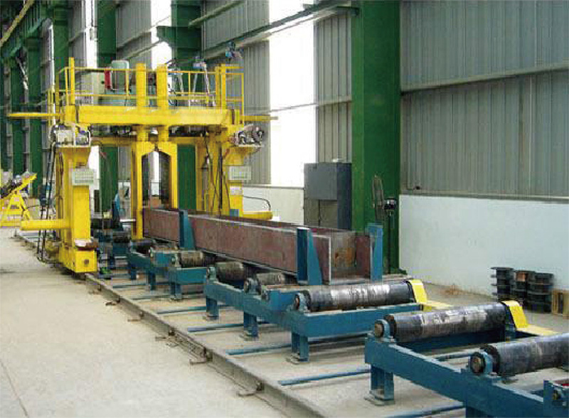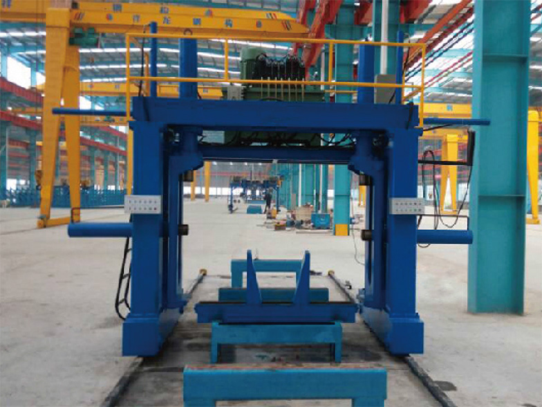 本機(jī)主要由導(dǎo)軌、行走驅(qū)動(dòng)裝置、機(jī)架與平臺(tái)、上壓緊裝置、側(cè)壓緊裝置、液壓系統(tǒng)、電控系統(tǒng)等部件組成。本機(jī)為手動(dòng)操作,采用工件不動(dòng),主機(jī)移動(dòng)的方式。與工件移動(dòng),主機(jī)不動(dòng)相比,主機(jī)移動(dòng)的定位效果準(zhǔn)確。本機(jī)主要用以完成∪型組立和箱型組立。本機(jī)適用工件尺寸可根據(jù)客戶需求定制。